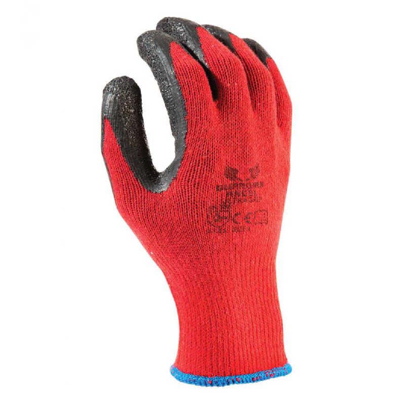 Black latex crinkle palm coated glove onto 10 gg machine knitted(crochet) red cotton liner. Excellent grip and dexterity makes this glove ideal for use when secure grip is important
