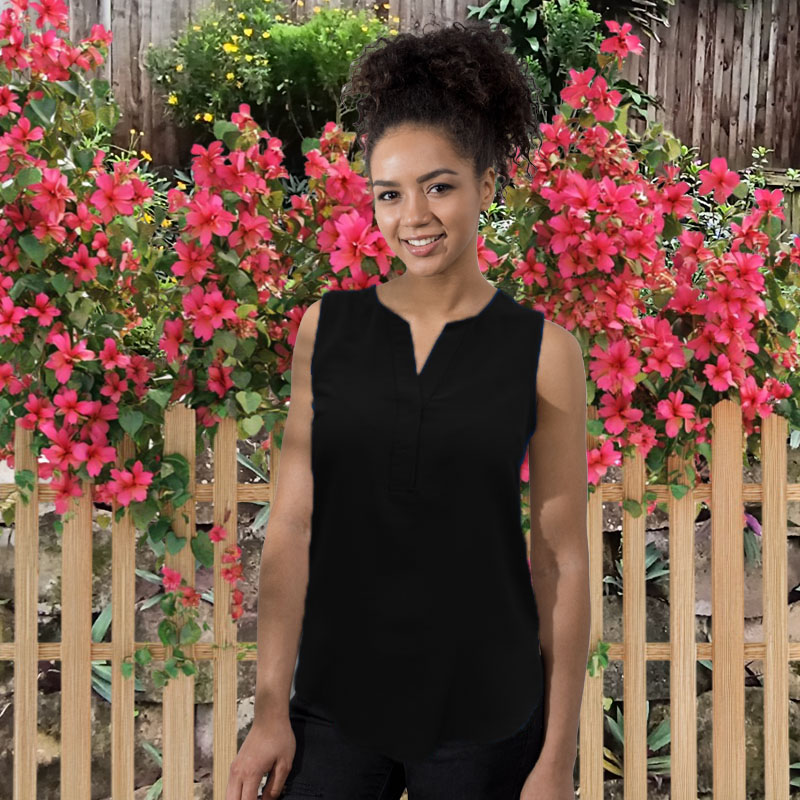 Sleeveless. V-neck blouse with concealed button placket