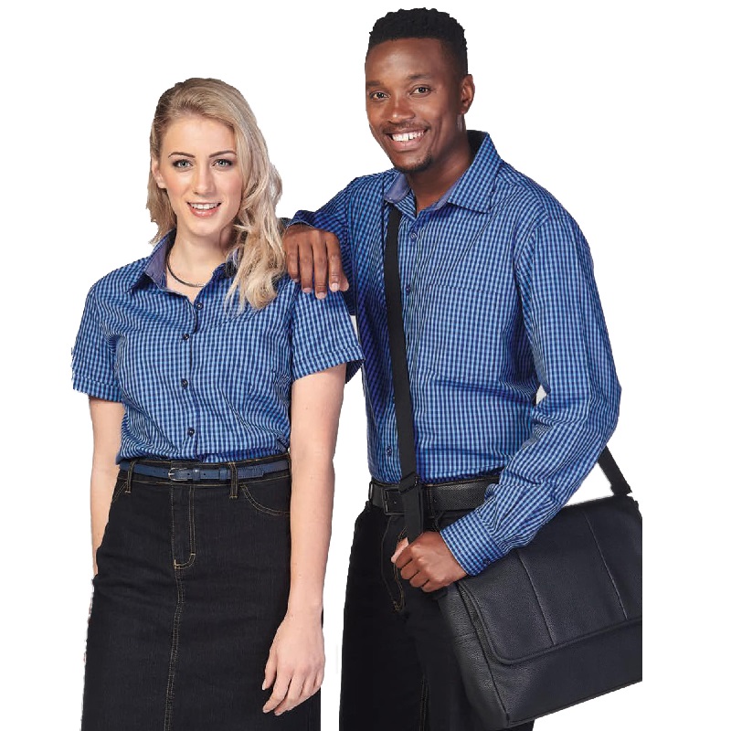 Amber S/S Blouse: Semi-fitted, with front and back darts, and side vents. Turn-back sleeve hems. Edgy contrast trim on placket and collar stand