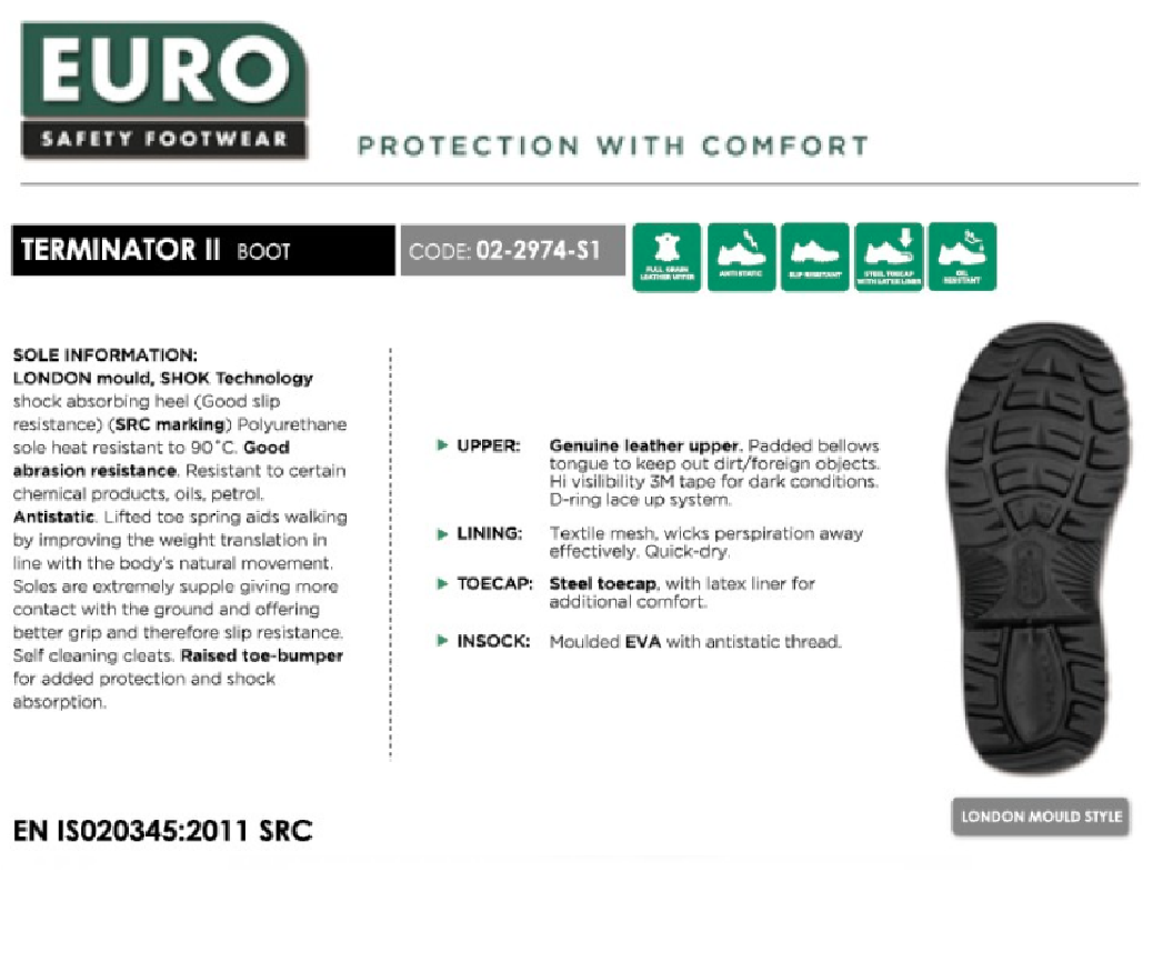The EURO TERMINATOR II is an entry level safety boot, that offers top level quality. The Euro Terminator II provides all the safety features of standard safety footwear with added comfort at an economical price. This boot will get the job done!
