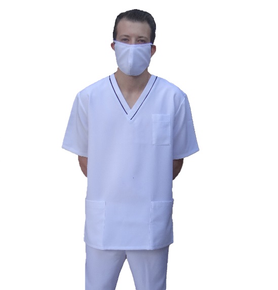 Basic mens scrub top with front neck piping details, 2 hip pockets and one breast pocket.
