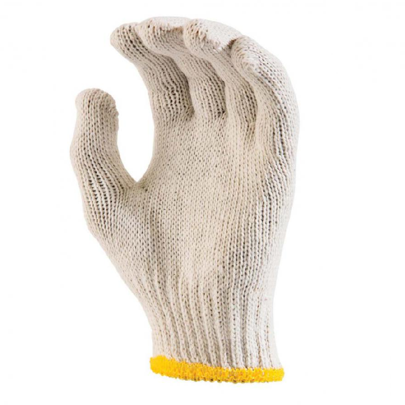 Machine knitted 7 guage (String Knit or Crochet) Natural white cotton (reversible) seamless glove. Elasticised composite knitted wrist, Colour coded and overlocked cuff. This glove is designed for extra comfort with superior durability. Being seamless knit with elastic cuff and reversible (wear on either hand) these gloves are more comfortable to the wearer. Knit construction stretches for excellent fit while allowing air to circulate to keep hands dry and comfortable. These gloves are ideal as medium duty industrial, general work and liner gloves.
